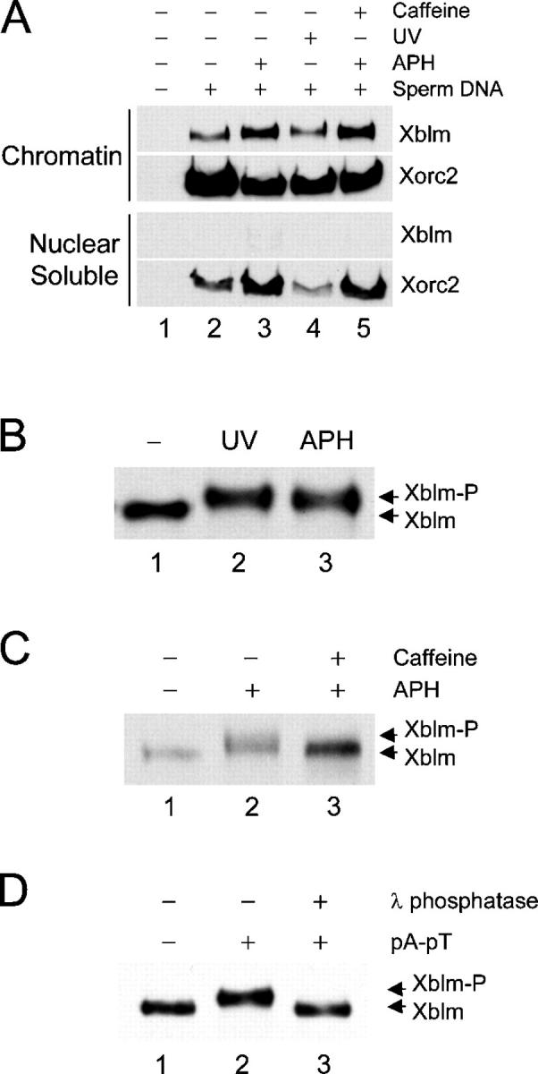 Figure 1. Xblm binds to chromatin and becomes phosphorylated in a checkpoint-dependent manner. (A) Extracts were incubated with no sperm chromatin (lane 1), untreated sperm chromatin (lane 2), sperm chromatin plus 100 μg/ml aphidicolin (APH; lane 3), UV-damaged sperm chromatin (lane 4), or sperm chromatin plus aphidicolin and caffeine (lane 5). After 90 min, nuclei were isolated and separated into nuclear soluble and chromatin fractions. The fractions were immunoblotted for Xblm and Xorc2 (as a loading control). (B) Extracts were incubated for 90 min with untreated sperm chromatin (lane 1), UV-damaged sperm chromatin (lane 2), or sperm chromatin plus aphidicolin (lane 3). Whole nuclear fractions were immunoblotted for Xblm. (C) Extracts were incubated with sperm chromatin alone (lane 1), sperm chromatin plus aphidicolin (lane 2), or sperm chromatin plus aphidicolin and caffeine (lane 3). Nuclear fractions were immunoblotted for Xblm. (D) Anti-Xblm immunoprecipitates from extracts containing no DNA (lane 1) or pA-pT (lanes 2 and 3) were incubated without (lanes 1 and 2) or with (lane 3) λ phosphatase and were immunoblotted for Xblm. |