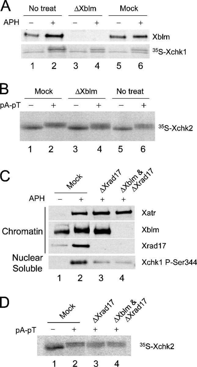 Figure 3. Xblm is not required for the checkpoint-dependent phosphorylation of Xchk1 or Xchk2. (A) Untreated (lanes 1 and 2), Xblm-depleted (lanes 3 and 4), and mock-depleted (lanes 5 and 6) egg extracts containing 35S-labeled Xchk1 were incubated for 90 min in the absence or presence of aphidicolin. Nuclear fractions were isolated and immunoblotted for Xblm or were examined for phosphorylation of 35S-labeled Xchk1 by SDS-PAGE and phosphorimaging. (B) Extracts were treated with control antibodies (lanes 1 and 2), anti-Xblm antibodies (lanes 3 and 4), or no antibodies (lanes 5 and 6). 35S-labeled Xchk2 was incubated in these depleted extracts for 90 min in the absence or presence of pA-pT. 35S-labeled Xchk2 in the whole-egg extracts was examined by phosphorimaging. (C) Extracts were treated with control antibodies (lanes 1 and 2), anti-Xrad17 antibodies (lane 3), or both anti-Xrad17 and anti-Xblm antibodies (lane 4). Extracts were incubated with sperm chromatin in the absence (lane 1) or presence (lanes 2–4) of aphidicolin. Chromatin fractions were immunoblotted for Xatr, Xblm, and Xrad17. Phosphorylation of Xchk1 in the soluble nuclear fraction was detected with anti-P-Ser344 antibodies. (D) Extracts were treated with control (lanes 1 and 2), anti-Xrad17 (lane 3), or both anti-Xrad17 and anti-Xblm (lane 4) antibodies. Phosphorylation of 35S-labeled Xchk2 after incubation in the absence (lane 1) or presence (lanes 2–4) of pA-pT in egg extracts was examined. |