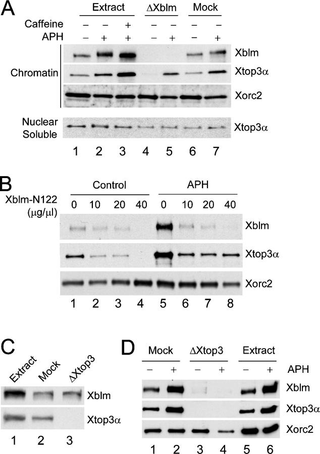 Figure 5. The NH2-terminal 122 amino acids of Xblm are involved in the interaction with Xtop3α on chromatin. (A) Extracts were treated with no antibodies (lanes 1–3), anti-Xblm antibodies (lanes 4 and 5), or control antibodies (lanes 6 and 7) and then incubated with sperm chromatin alone (lanes 1, 4, and 6), sperm chromatin plus aphidicolin (lanes 2, 5, and 7), or sperm chromatin plus aphidicolin and caffeine (lane 3). After 90 min, nuclear fractions were isolated and separated into chromatin and nuclear soluble fractions. These fractions were immunoblotted for Xblm, Xtop3α, and Xorc2. (B) The NH2-terminal 122 amino acids of Xblm are required for interaction with Xtop3α on chromatin. Egg extracts containing sperm chromatin were incubated in the absence (lanes 1–4) or presence (lanes 5–8) of aphidicolin. The extracts were also treated without (lanes 1 and 5) or with (10–40 μg/μl; lanes 2–4 and 6–8) Xblm-N122. After 90 min, chromatin fractions were immunoblotted for Xblm, Xtop3α, and Xorc2. (C) Extracts were treated with no antibodies (lane 1), control antibodies (lane 2), or anti-Xtop3α antibodies (lane 3) and were immunoblotted for Xblm (top) and Xtop3α (bottom). (D) Mock-depleted extracts (lanes 1 and 2), Xtop3α- depleted extracts (lanes 3 and 4), and extracts treated with no antibodies (lanes 5 and 6) from C were incubated with sperm chromatin in the absence (lanes 1, 3, and 5) or presence (lanes 2, 4, and 6) of aphidicolin. Chromatin fractions were isolated and immunoblotted for Xblm, Xtop3α, and Xorc2. |