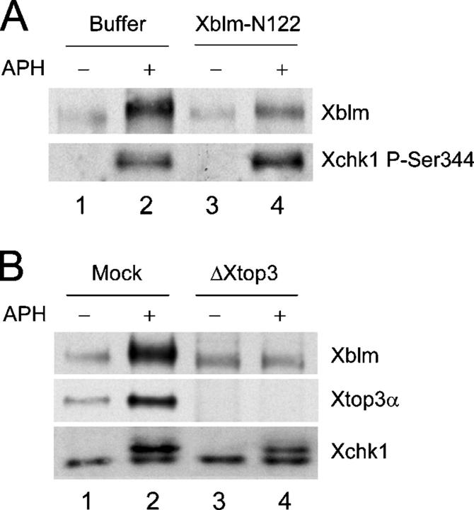 Figure 6. Phosphorylation of Xblm depends on association with Xtop3α. (A) Buffer alone (lanes 1 and 2) or Xblm-N122 (100 μg/μl; lanes 3 and 4) was added to extracts lacking (lanes 1 and 3) or containing (lanes 2 and 4) aphidicolin. After 90 min, nuclear fractions were isolated and immunoblotted with antibodies against Xblm and P-Ser344 of Xchk1. (B) Mock-depleted (lanes 1 and 2) and Xtop3α-depleted (lanes 3 and 4) extracts were incubated with sperm chromatin in the absence (lanes 1 and 3) or presence (lanes 2 and 4) of aphidicolin. After 90 min, nuclear fractions were isolated and immunoblotted with antibodies against Xblm, Xtop3α, and the whole Xchk1 protein. |