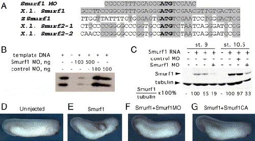 Fig. 2. Characterization of Smurf1 MO and Smurf1CA effectiveness. (A) Alignment of Smurf1 MO sequence with Xenopus laevis (X.l.) Smurf1, zebrafish Danio rerio Smurf1 (zSmurf1) and two versions of X. laevis Smurf2. The translation start site is in bold. (B, C) The amount of Smurf1 protein produced by in vitro translation (B) or in the embryos injected with Smurf1 mRNA (C) is reduced in the presence of Smurf1 MO, but not control MO. (DâG) Smurf1 MO (F) and Smurf1CA (G) block secondary axis induction by the wild-type Smurf1 (E). |