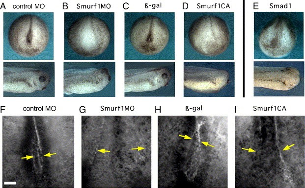 Fig. 3. Knockdown of endogenous Smurf1 results in neural defects. (AâD) Smurf1 MO (B) and Smurf1CA (D), but not control MO (A) or control β-gal mRNA (C) cause neural tube closure defects at neurula stages (top row) and microcephaly and microphtalmy at tailbud stages (bottom row). This phenotype is mimicked by 1â6 ng Smad1 mRNA overexpression (E). (FâI) F-actin accumulation at the neural fold hinge points at stage 18, revealed by phalloidin staining. Control embryos (F, H) have normal loop-shaped pattern. In Smurf1MO (G) or Smurf1CA embryos (I), f-actin staining is weak and the distance between the lateral hinge points is increased. Scale bar = 0.1 mm. |