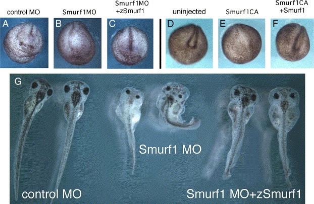 Fig. 4. Rescue of Smurf1 MO and Smurf1CA embryos by wild-type Smurf1. (AâC, G) Neural folding defect (B) and overall phenotype of tadpoles caused by Smurf1MO is rescued by 0.1Â ng of zSmurf1 mRNA (C, G). (DâF) Smurf1CA embryos are similarly rescued by X. laevis Smurf1. |