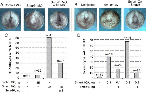 Fig. 9. A Smad1/5 antagonist, Smad6, rescues the Smurf1 knockdown phenotype. (A, B) Representative stage 18 (A) and stage 17 (B) embryos. (C, D) Summary of Smurf1 MO (C) and Smurf1CA (D) rescue by Smad6 (nânumber of embryos). |