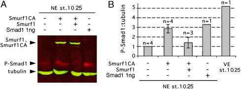 Fig. 11. Phospho-Smad1 levels are elevated in Smurf1CA embryonic neuroectoderm. Dorsal (prospective neural) ectoderm was cut from stage 10.25 embryos injected with indicated mRNAs and analyzed by Western blotting (A). (B) Quantitation of relative P-Smad1/5 levels summarized from four experiments (nânumber of experiments, error barsâstandard deviation). |