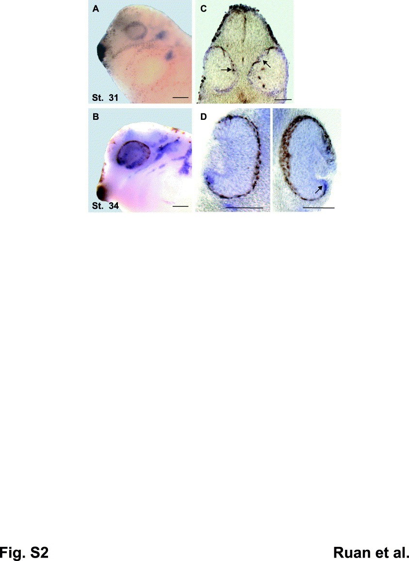 Figure S2. In situ hybrididation showing Xcadherin-6 expression in the eye. (A) Ring-like expression domain of Xcadherin-6 at stage 31. (B) Transverse section of (A) yielding Xcadherin-6 transcripts in the outer layer of the optic cup. Arrows point to overlap with pigment cells. (C) Horshoe-like expression domain at stage 34. (D) Transverse section of (C), transcripts are restricted to the ciliary marginal zone. Scale bar: 100 μm.