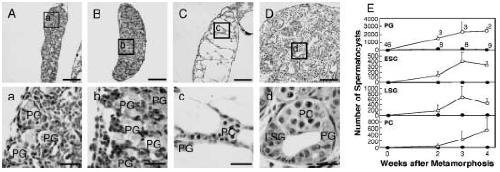metamorphosis. Sections were stained with hematoxylin and eosin. Each higher magnification view of the testis (a, b, c or d) is an