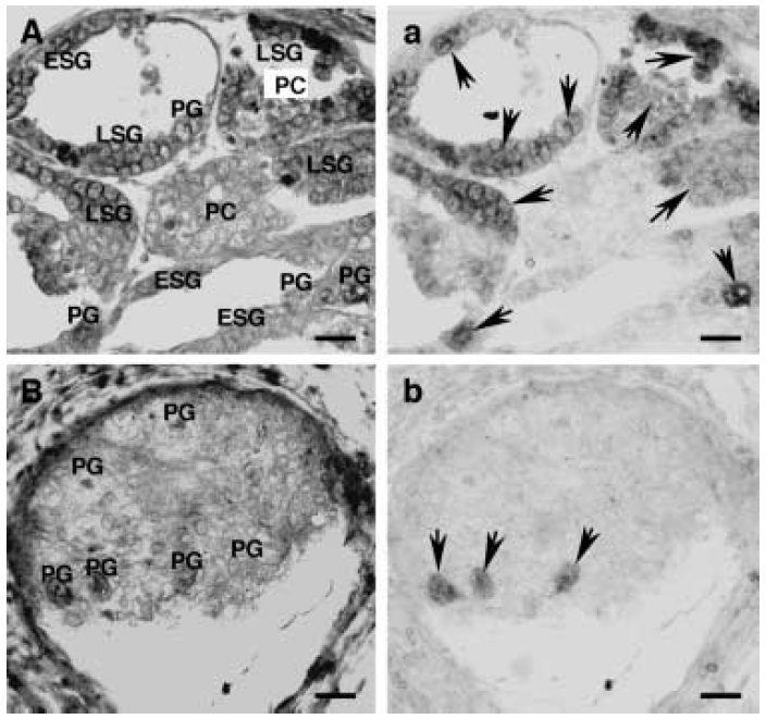 from juvenile testes. (A, a) Section of juvenile testis. (B)