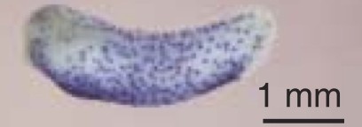 Fig.5. Induction of peroxidase 2 (POX2) expression in ventral marginal zone (VMZ) explants. Prospective VMZ at the 4-cell stage injected with mRNA coding for the BMP signal inhibitor and/or the wnt signal inhibitors. VMZ explants excised at the early gastrula stage were cultured until stage 28–30 and processed for whole-mount in situ hybridization analysis. Expression of POX2 (A–F), nkx2.5 (G), otx2 (H), α-globin (I) and LuRP (J, K) was examined in cultured VMZ explants that had been previously injected with β-gal (300 pg) (A), tBR (1000 pg) (B), tBR (1000 pg) + dkk1 (50 pg) (C), dkk1 (50 pg) (D, G, H, I, K), frzb-1 (800 pg) (E), or cerberus (600 pg) (F) mRNA. POX2 was strongly induced by dkk1 mRNA but was not induced by tBR mRNA. The VMZ explants injected with dkk1 mRNA did not express other anterior tissue markers, such as otx2 or nkx2.5. Instead, they expressed a ventral mesoderm marker, such as α- globin. Another leukocyte marker, LURP-1, was also strongly induced by dkk1 mRNA injection (50 pg) (J, K). L shows the expression of LURP-1 in stage 30 embryos. |