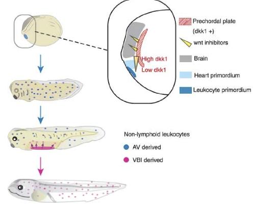 Fig. 8. Induction and distribution of myeloid cells derived from the anterior ventral (AV) region of the neurula embryo. At the early neurula stage wnt inhibitors, such as dkk1, frzb-1 and crescent, were expressed in the prechordal plate and anterior endoderm (diagonal area). A high dose of dkk1 induces the heart mesoderm, while a low dose of dkk1 induces myeloid cells. The differentiated leukocytes start to migrate toward the posterior area at the tailbud stage. At the swimming tadpole stage, ventral blood island (VBI)- derived leukocytes appear, in addition to AV-derived leukocytes, and the former become a major population at the feeding tadpole stage. |