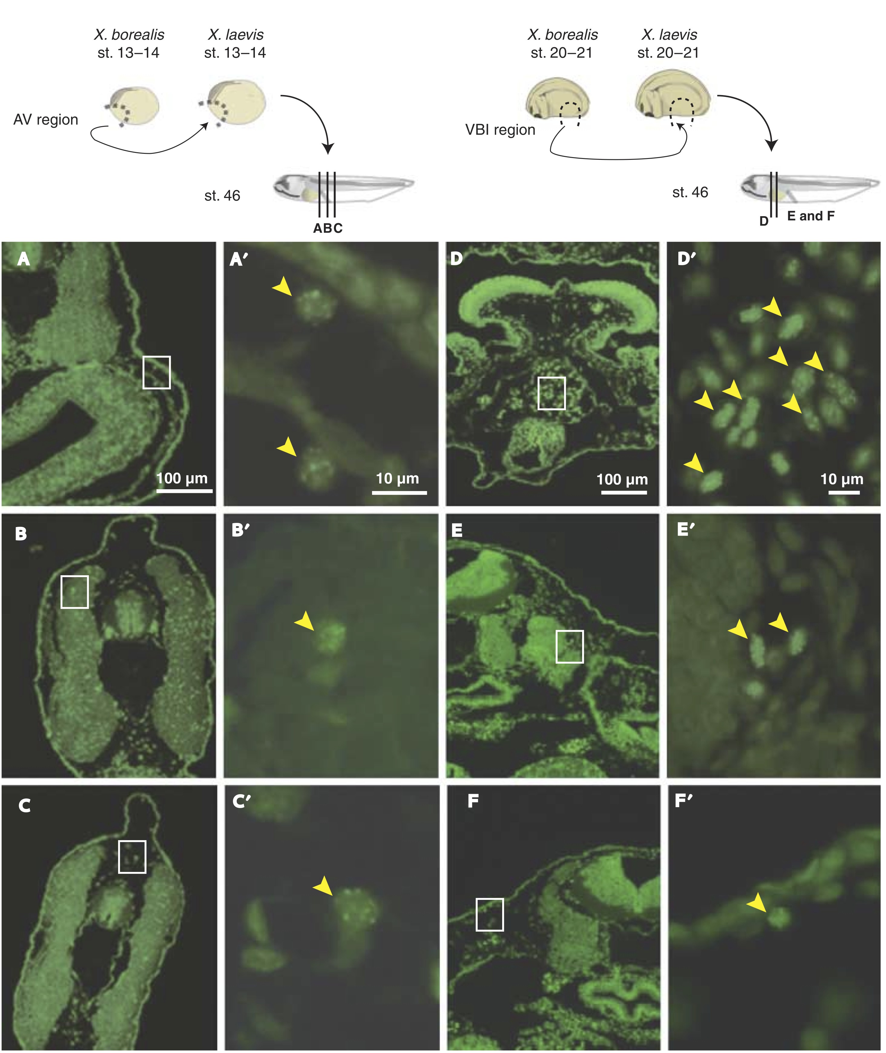 Fig. 3. Distribution of anterior ventral (AV)- and ventral blood island (VBI)-derived cells in the mesenchyme and peripheral blood at the early tadpole stage. The AV regions of Xenopus borealis embryos at stage 13â14 were excised and orthotopically transplanted into Xenopus laevis embryos. As a control experiment, the VBI regions of borealis embryos at stage 20â21 were transplanted. The host embryos were allowed to develop until appropriate stages and were fixed for histological examination to detect borealis (donor) cells. (AâF) Quinacrine-stained sections of AV-grafted animals (AâC) and VBI-grafted animals (DâF) at stage 46. AââFâ are high magnification views of AâF. Borealis nuclei have brightly stained spots after staining with quinacrine (arrowheads in AââFâ). Significant numbers of borealis cells were observed in the mesenchyme near the epidermis (A, Aâ), the spinal cord (C, Câ) and in the somite (B, Bâ) of AV-grafted animals. In contrast, many borealis cells were observed in the heart (D, Dâ), blood vessels (E, Eâ) and mesenchyme (F, Fâ) of VBI-grafted animals. |
