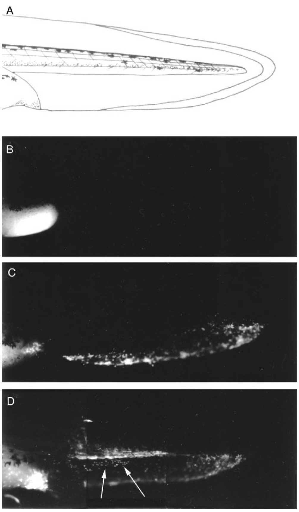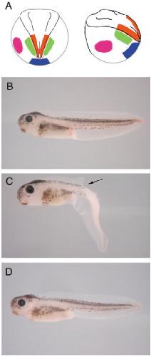 Fig. 2. Role of the neural crest. A: Schematic of neurulaembryo stage 13. Dorsal and side view. Red areas represent the posterior neural crest ablated in C. Green areas represent the posterior dorsal finepidermis ablated in D. Blue areas represent the ventral region. Pink areas represent the lateral region. B: Control embryo stage 41. C: Ablation of the posterior neural crest at stage 13. Embryo cultured to stage 41. Embryo shows loss of the dorsal fin from arrow, except at the very tip. The ventralfin remains unaffected. D: Ablation of the dorsal finepidermis at stage 13. Embryos cultured to stage 41. No fin defect is observed. n 35 for C, n 30 for D.