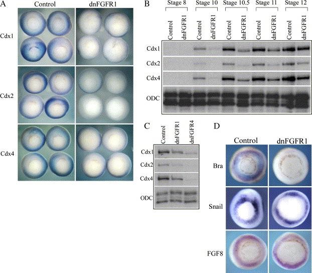 Fig. 1. Inhibition of Cdx gene expression with a dominant negative FGF receptor. Panel A shows whole-mount in situ hybridization analysis for Cdx1, Cdx2 and Cdx4 expression at gastrula stage 11 in control embryos and embryos injected with 4 ng dnFGFR1 mRNA. Panel B is an RNAase protection analysis (RPA) showing the expression of Cdx genes from mid blastula to mid gastrula stages, in control embryos and embryos injected with 4 ng dnFGFR1 mRNA. Ubiquitously expressed ornithine decarboxylase (ODC) was included as a loading control. Panel C is an RPA showing the expression of Cdx genes in control embryos and embryos injected with 4 ng dnFGFR1 or dnFGFR4 mRNA at gastrula stage 10.5. Panel D shows whole-mount in situ hybridization analysis for Brachyury (Bra), Snail (Sna) and FGF8 at gastrula stage 11 in control embryos and embryos injected with 4 ng dnFGFR1.