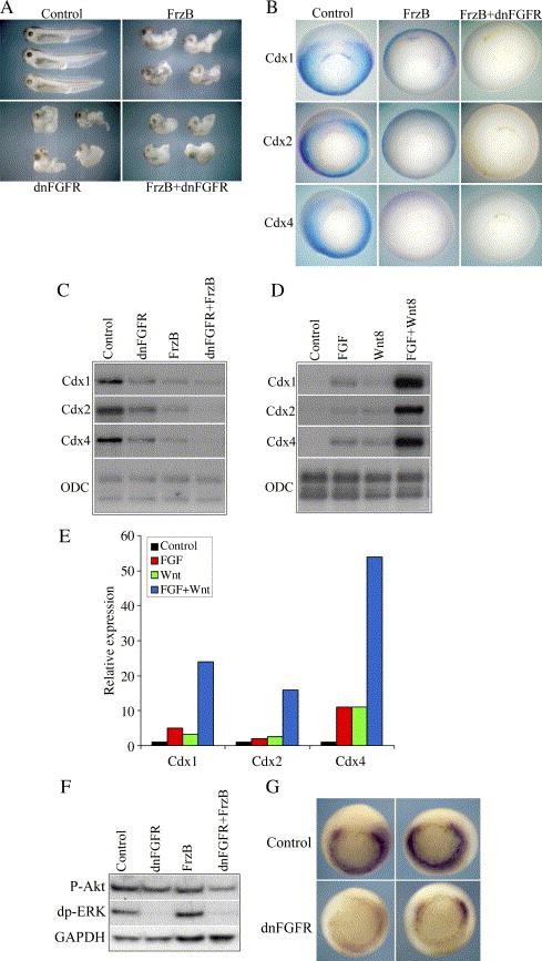 Fig. 5. Combinatorial activity of FGF and wnt signaling. Panel A shows the phenotype at swimming larva stage 41 of control embryos and embryos injected with 2 ng FrzB mRNA or 2 ng dnFGFR1 mRNA or 2 ng FrzB mRNAÂ +Â 2 ng dnFGFR1 mRNA. Panel B shows whole-mount in situ hybridization analysis for Cdx1, Cdx2 and Cdx4 expression at gastrula stage 11 in control embryos and embryos injected with 2 ng FrzB mRNA or 2 ng FrzB mRNAÂ +Â 2 ng dnFGFR1 mRNA. Panel C is an RPA showing the expression of Cdx genes at gastrula stage 11 in control embryos and embryos injected with 2 ng dnFGFR1 mRNA or 2 ng FrzB mRNA or 2 ng FrzB mRNAÂ +Â 2 ng dnFGFR1 mRNA. Panel D is an RPA showing Cdx gene expression at control stage 13 in control animal cap explants and animal cap explants from embryos injected with 10 pg FGF4 mRNA or 50 pg wnt8 mRNA or 10 pg FGF4 mRNAÂ +Â 50 pg wnt8 mRNA. Panel E is a bar chart showing the relative levels of expression as determined by densitometric analysis of each Cdx gene in the animal caps analyzed in panel D. Expression levels are normalized to the ODC loading control and the expression of each gene is shown relative to expression in untreated control caps. Panel F is a Western blot of control embryos and embryos injected with 2 ng dnFGFR1 mRNA or 2 ng FrzB mRNA or 2 ng FrzB mRNAÂ +Â 2 ng dnFGFR1 mRNA probed for p-S473 Akt, dp-ERK and GAPDH at gastrula stage 10.5. Panel G shows whole-mount in situ hybridization analysis of wnt8 expression at gastrula stage 11 in control embryos and embryos injected with 4 ng dnFGFR1 mRNA.