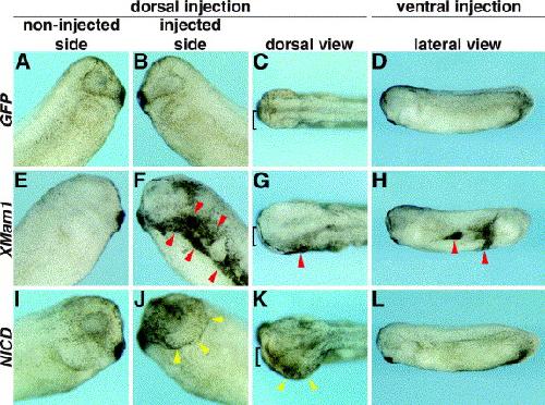 Fig. 2. Overexpression of XMam1 generates hyperpigmented cell mass. To examine the role of XMam1 in early development, 2 ng of GFP (AâD), XMam1 (EâH) and NICD (IâL) were injected into one dorso- or ventroanimal blastomere at the 8-cell stage and the phenotype was observed. (A, E, and I) Control side. (B, F, and J) Injected dorsal side. (C, G, and K) Dorsal view of the embryo injected into dorsal side. Black rectangles represent injected side. (D, H, and L) Lateral view of the embryo injected into ventral side. XMam1 generated a cell mass with pigmentation in embryos injected on both dorsal and ventral sides (red arrowheads). Embryos injected with NICD into dorsal side showed brain enlargement (yellow arrowheads)