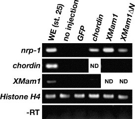 Fig. 8. XMam1 induces nrp-1 expression in a Notch-independent manner. To test whether XMam1 is able to induce nrp-1 expression without interaction with Notch signaling molecules, XMam1DN was injected into both blastomeres of 2-cell stage embryos. Animal caps were dissected from the injected embryo and gene expression was analyzed at st. 25 by RT- PCR. XMam1DN induced nrp-1 expression as well as XMam1 without the ectopic gene expression of chordin. Chordin also induced nrp-1 expression without the gene expression of XMam1. GFP was used as the tracer for microinjection. Histone H4 was used as an internal control. WE, whole embryo; ND, no data.