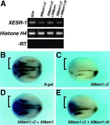 Fig. 7. XMam1δN is not involved in Notch signaling. To confirm that XMam1δN is not involved in Notch signaling, we examined whether XMam1δN could rescue the down-regulation of XESR-1 transcription caused by XMam1δC. Samples were injected into one blastomere of 2-cell stage embryos and XESR-1 expression was analyzed at st. 14 by RT-PCR (A) or by whole-mount in situ hybridization (BâE). XESR-1 expression was suppressed by injecting with XMam1δC (AâC). The suppression of XESR-1 expression by XMam1δC could be rescued by co-injecting with XMam1 (A and D), but not with XMam1δN (A and E). Black rectangles in BâE represent the injected side. The injected region was colored blue by β-galactosidase staining.