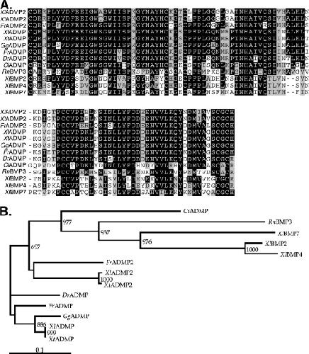 Fig. 1. The predicted ADMP2 protein. (A) Alignment of mature domain of Xenopus laevis ADMP2 (XlADMP2) with other members of the TGF-β family. (B) The schematic representation of the relationship between XlADMP2 and members of the ADMP and BMP families. The number at each branch point represents the relative incidence of that particular relationship during bootstrap resampling using 1000 replicates. The scale bar at the left bottom indicates an evolutionary distance of 0.1 amino acid substitution per position.
