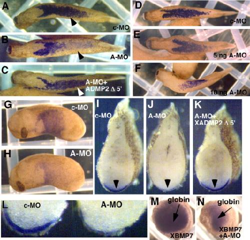 Fig. 7. ADMP2 loss and blood formation. (A and B) Posterior injection of 10 ng of antisense ADMP2 morpholino oligonucleotide (A-MO) into each of the two posterior blastomeres at the four cell stage inhibited the expression of globin in the posteriorventralblood islands (c-MO: control morpholino). (C) Co-injection of 10 pg of ADMP2 δ-5â² UTR RNA (total 20 pg) with A-MO restored globin expression (white arrowhead). (DâF) Anterior injection of 5 and 10 ng/blastomere of A-MO. While the 5 ng dose inhibited globin expression when injected posteriorly (E), no reduction in globin was observed at this dose anteriorly. At 10 ng (F) a strong reduction in globin expression anteriorly was observed. (G and H) The expression of SCL, an early blood marker, was also reduced by injection of 10 ng of A-MO posteriorly when examined at stage 24. (I and J) Transverse sections at the level of the posteriorblood islands show that the expression of globin was decreased to a thin layer in the A-MO-injected embryos (black arrowhead in panel J compared to that in panel I). (K) In embryos co-injected with A-MO and ADMP2 δ-5â² UTR RNA, the globin-expression extended deep into the mesodermal layer. (L) Enlarged view of ventral mid-line showing globin expression in either c-MO (left) or A-MO-injected embryos. (M, N) Coinjection of 10 ng A-MO into each blastomere at four cell stage reduced globin expression in response to BMP7 RNA injection (1 ng per embryo). Note that both control (M) and A-MO-injected embryos (N) have the same DAI 0 phenotype.
