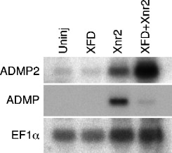 Fig. 3. Regulation of ADMP2 expression in animal caps and whole embryos. Northern blot of RNA from stage 10.5 animal caps injected with 1 ng of Xnr2 with or without 400 pg of XFD RNAs. The figure shows the results of hybridizations for ADMP2, ADMP and EF1α (loading control). Xnr2 RNA alone induces a low level of ADMP2 expression in animal caps, while co-injection of XFD RNA causes a much higher level of ADMP2 expression. ADMP expression, on the other hand, was inhibited by XFD.