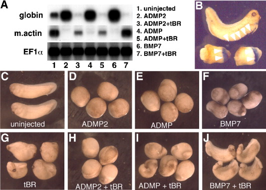 Fig. 4. Overexpression of ADMP2. (A) Northern blot of RNA from stage 32 sibling embryos of the ones shown in panels CâF and HâJ. The figure shows the results of hybridizations for globin, muscle actin (m.actin) and EF1α (loading control). The expression of globin was increased by overexpression of ADMP2, ADMP or BMP7 RNA (lanes 2, 4 and 6 compared to lane 1), while that of m.actin was virtually eliminated by the same treatment (lane 2, 4 and 6 compared to lane 1). The level of m.actin expression in the BMP7-injected embryos was rescued to normal levels by co-injection of tBR RNA (lane 7 compared to lane 1). However, in the ADMP2 or ADMP-injected embryos, co-injection of tBR RNA failed to rescue m.actin expression (lanes 3 and 5 compared to lane 1). (B) The phenotype and globin expression by in situ hybridization in ADMP2-overexpressed embryos. The expression of a blood marker, globin, is normally detectable in the ventral-most region of the tailbud stage embryo at stage 32 (white arrowheads in top embryo). Overexpression of ADMP2 caused a typical DAI 0 phenotype (two bottom embryos). The expression of globin was restricted in the leading edge mesoderm of these embryos (white arrowheads) at the equivalent of stage 32. (CâJ) Rescue experiments by co-injection of tBR RNA. Overexpression of either ADMP2, ADMP or BMP7 RNA caused a similar DAI 0 phenotype (CâE compared to B). However, only the phenotype caused by overexpression of BMP7 was rescued by co-injection of tBR RNA (GâI), suggesting that ADMP2 and ADMP do not bind the BMP receptor. (G) The phenotype of tBR RNA-injected embryos. All the embryos shown are at stage 32.