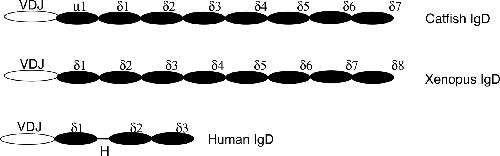 Structure of IgD heavy chains in different vertebrates. Catfish IgD (GenBank accession no. U67437); human IgD (GenBank accession no. AAB21246); H, hinge region. |