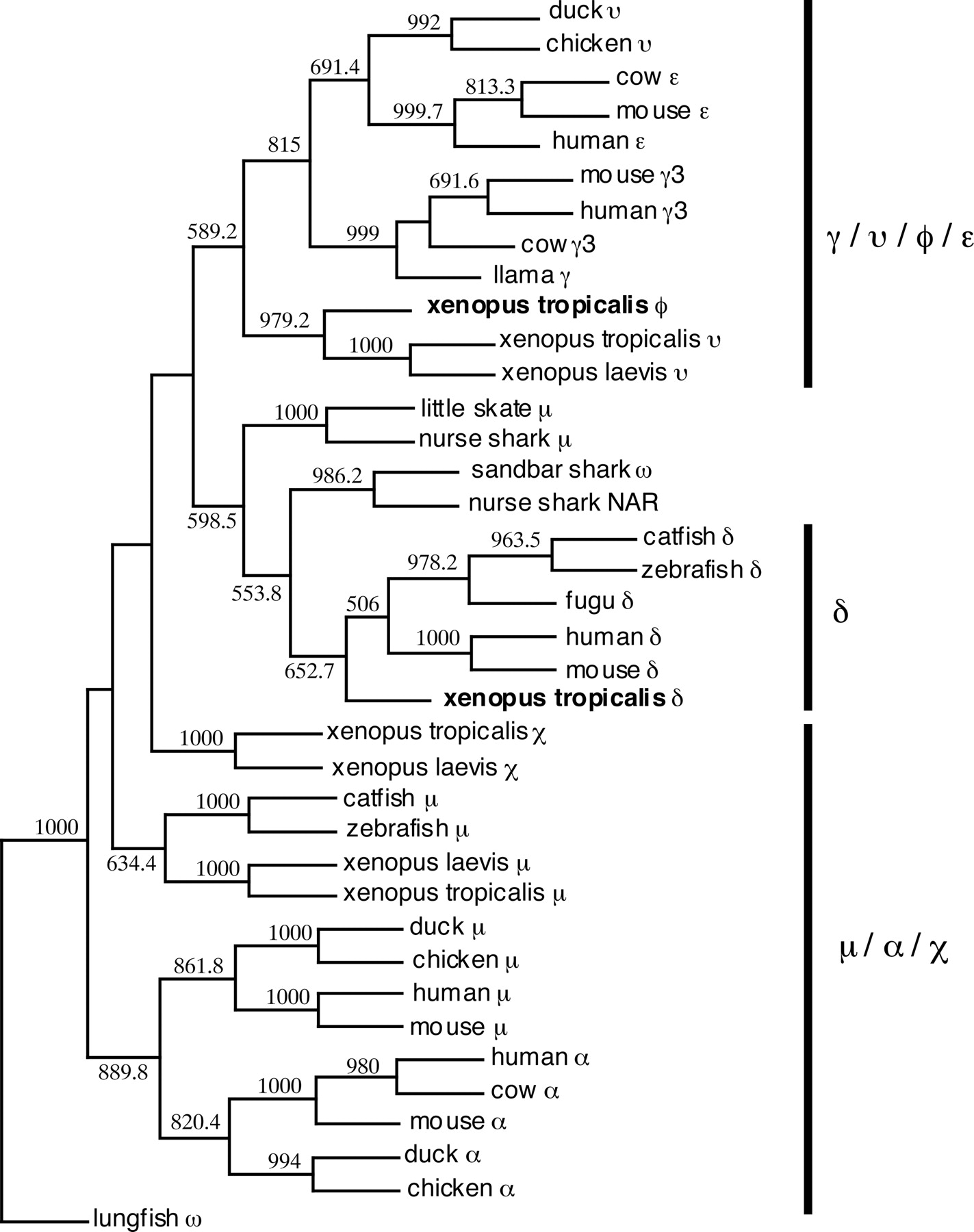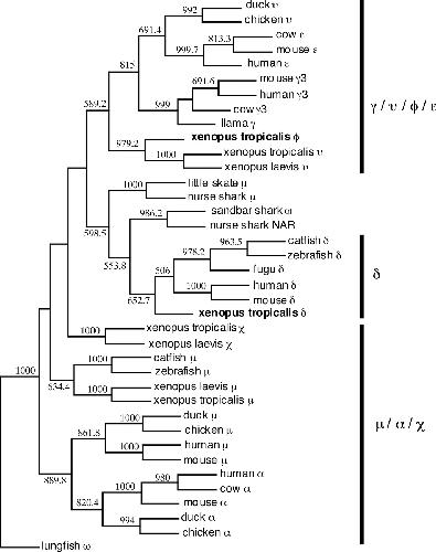An unrooted phylogenetic tree of Igs in vertebrates. The tree was constructed by using protein sequences of the first and last CH domains (fish δCH6 and Xenopus δCH7 were used as the last domain) of all heavy-chain classes. Except for the Ig sequences obtained in this study, all other sequences were taken from the GenBank database, with the following accession numbers: Cδ gene: catfish (AF363450), fugu (AB159481), human (BC021276), mouse (J00449), and zebrafish (BX510335); Cμ gene: catfish (M27230), chicken (X01613), duck (AJ314750), human (X14940), mouse (V00818), nurse shark (M92851), little skate (M29679), X. laevis (BC084123), and zebrafish (AY643751); Cα gene: chicken (S40610), cow (AF109617), duck (U27222), human (P01877), and mouse (BC010324); Cε gene: cow (BTU63640), human (AK130825), and mouse (X01857); Cγ gene: cow (S82407), human (BX640623), llama (AF305955), and mouse (AY498569); Cυ gene: chicken (X07174), duck (AJ314754), and X. laevis (X15114); and Cχ gene: X. laevis (BC072981), nurse shark NAR (U18701), sandbar shark IgW (U40560), and lungfish IgW (AF437727). |