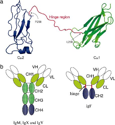 Structure of Igs in X. tropicalis. (a) A ribbon representation of the predicted structural model of the X. tropicalis IgF heavy chain. The CH1 and CH2 domains are colored green and blue, respectively. The putative hinge region between the two domains is colored red. Note that the hinge between CH1 and CH2 contains a gap (Ser-248 to Gly-252), which is due to the absence of corresponding residues in the template structure. The figure was prepared with PyMOL software. (b) Domain structure of IgF as compared with IgM, IgX, and IgY. There is only one cysteine in the C terminus of the CH2 domain of IgM for potential inter-heavy-chain disulfide bonding. CH, heavy-chain constant region domain; CL, light-chain constant region domain; VH, heavy-chain variable region; VL, light-chain variable region. |