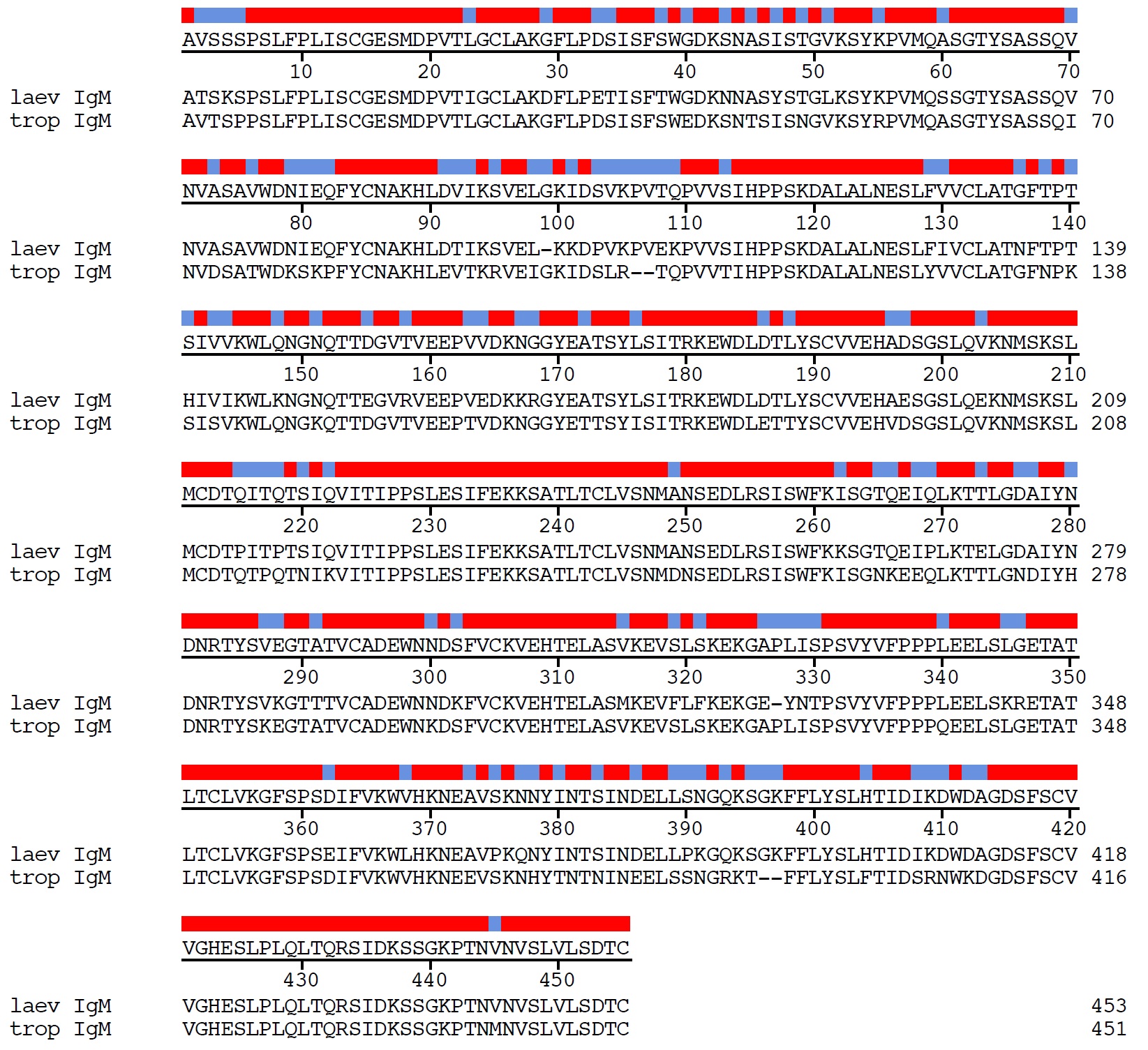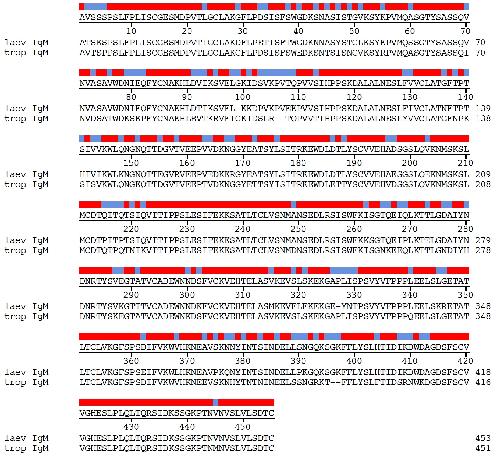 Fig. 6. Sequence alignment of the IgM heavy-chain constant region in Xenopus tropicalis and Xenopus laevis. The alignment was performed by using the ClustalW method in MegAlign (DNASTAR, Madison, WI). Trop, X. tropicalis; Laev, X. laevis. |