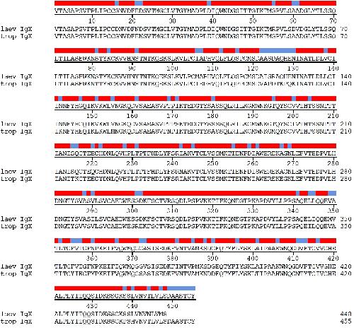 Fig. 7. Sequence alignment of the IgX heavy-chain constant region in X. tropicalis and X. laevis. The alignment was performed by using the ClustalW method in MegAlign (DNASTAR). Trop, X. tropicalis; Laev, X. laevis.