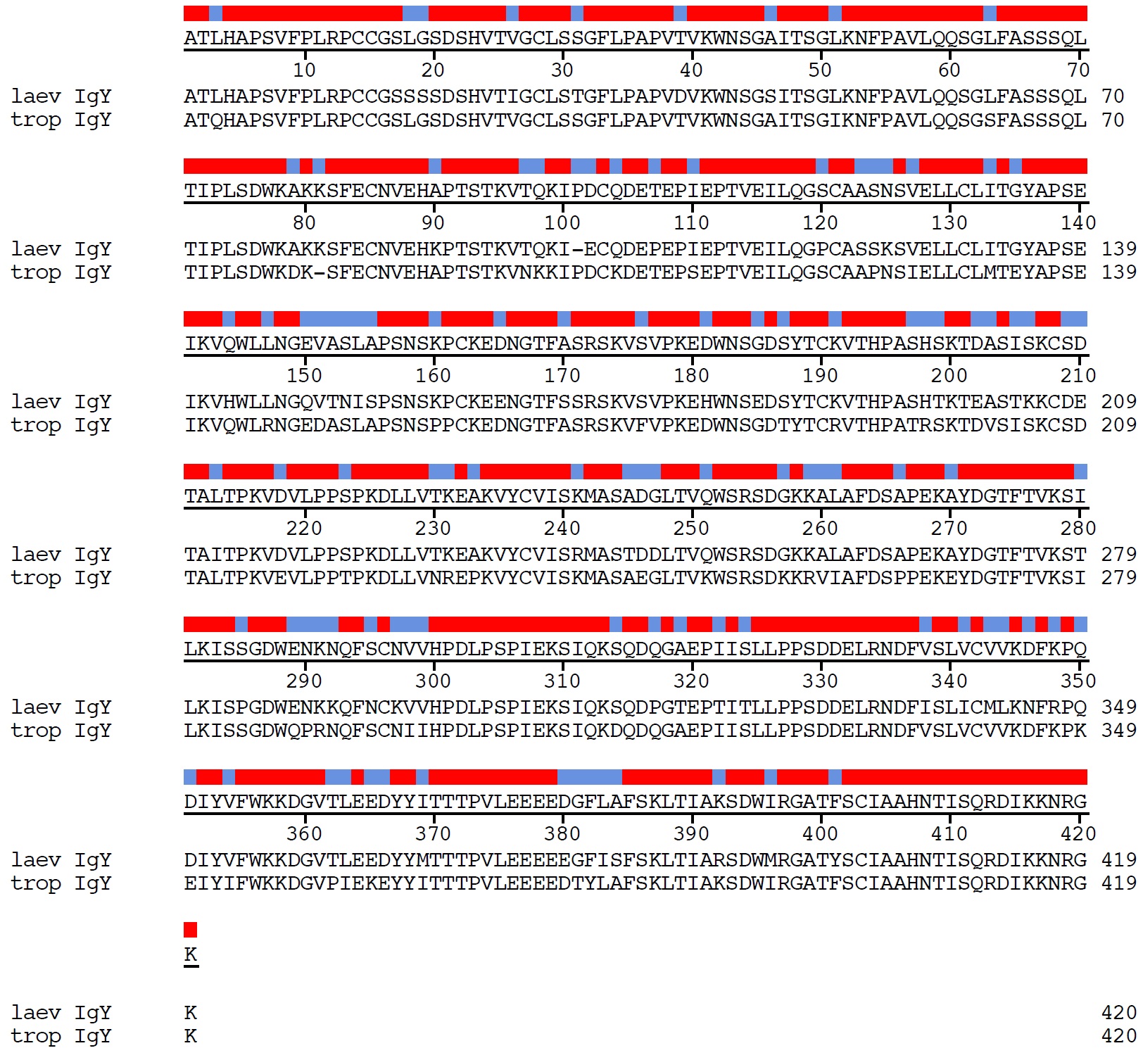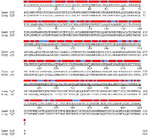 Fig. 8. Sequence alignment of the IgY heavy-chain constant region in X. tropicalis and X. laevis. The alignment was performed by using the ClustalW method in MegAlign (DNASTAR). Trop, X. tropicalis; Laev, X. laevis.