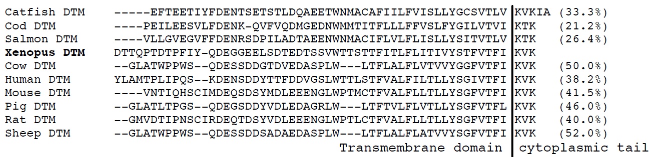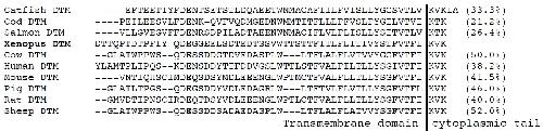Fig. 9. Sequence alignment of IgD transmembrane regions from different species. The alignment was performed by using the ClustalW method in MegAlign (DNASTAR). The percentage value after each sequence indicates its percentage identity to the X. tropicalis IgD transmembrane region. Except for the X. tropicalis IgD sequence, which was identified in this study, all other sequences were taken from the GenBank database, with the following accession numbers: catfish IgD, U67437; cod IgD, AF155200; cow IgD, AF515672; human IgD, BC063384; mouse IgD, AJ851868; pig IgD, AF515674; rat IgD, AY148495; salmon IgD, AF141606; and sheep IgD, AF515673.