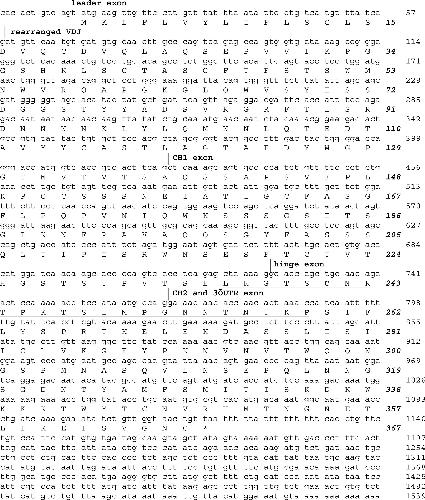 Fig. 11. Nucleotide and the deduced amino acid sequences of an IgF cDNA (GenBank accession no. BC087793). Leader, leader peptide; VDJ, rearranged variable region. The hinge, including segments encoded within CH1 and CH2 exons, is underlined. The cysteine and prolines are in bold. |