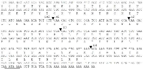 Fig. 12. Sequence of the membrane-bound form of IgF. Stop codons are indicated by inverted filled triangles; the poly(A) addition signal is underlined. CH2, second constant region domain; M1–4, exons encoding the transmembrane region and the cytoplasmic tail.