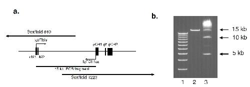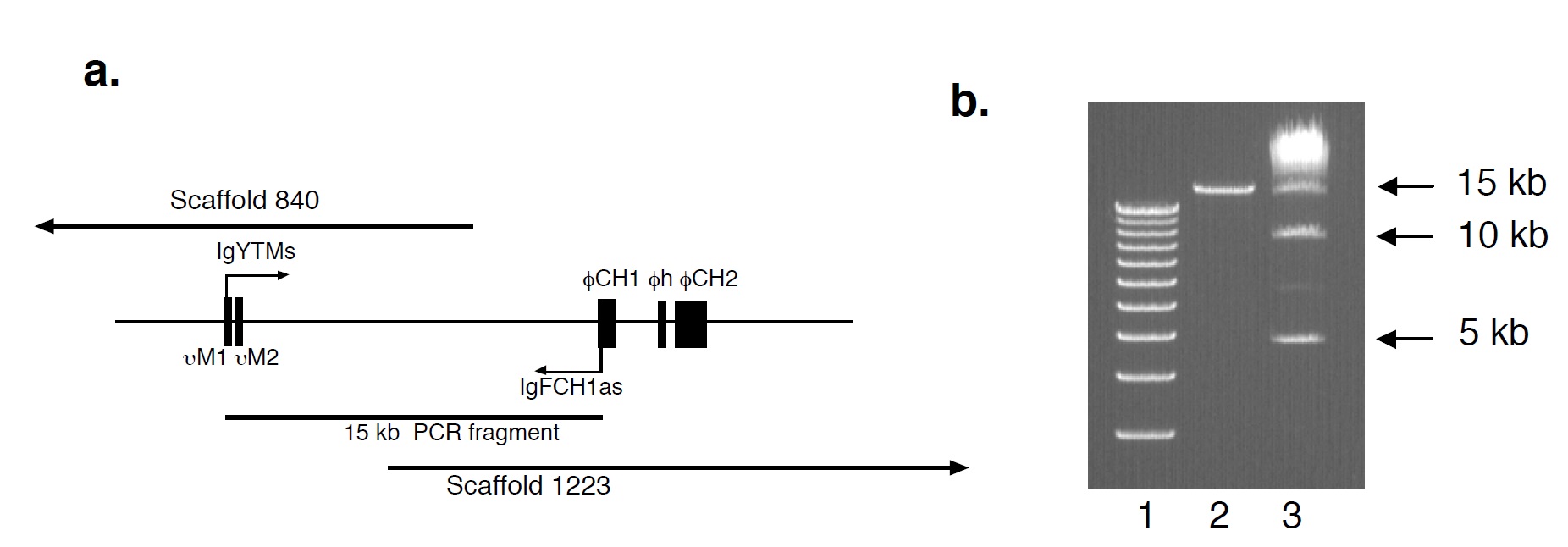 Fig. 13. Long PCR amplification of the intron DNA between the u and f genes. (a) Strategy for the long PCR. The primers IgYTMs and IgFCH1as were used. M, region encoding transmembrane region; CH, region encoding the constant domain exon; h, hinge-encoding exon. (b) Long PCR amplification result. Lane 1, 1-kb DNA ladder; lane 2, amplified PCR product; lane 3, 5-kb DNA ladder.