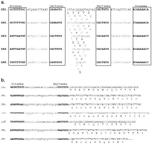 Fig. 14. DH (a) and JH (b) gene segments in X. tropicalis. Recombination sequence signals, including nonamers and heptamers, are in bold.