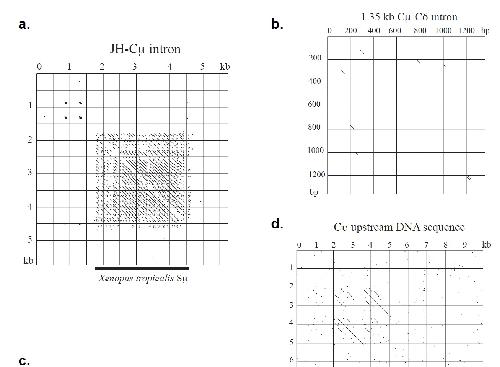 Fig. 15. Dotplot analysis of the JH–Cm intron sequence. Sequence comparison was carried out by using the one-pair dotplot of MegAlign (DNASTAR). The JH–Cm intron was analyzed by using the following parameters: percentage, 80%; window, 30; minimum quality, 1. The parameters used for all of the other sequences were: percentage, 65%; window, 30; minimum quality, 1.