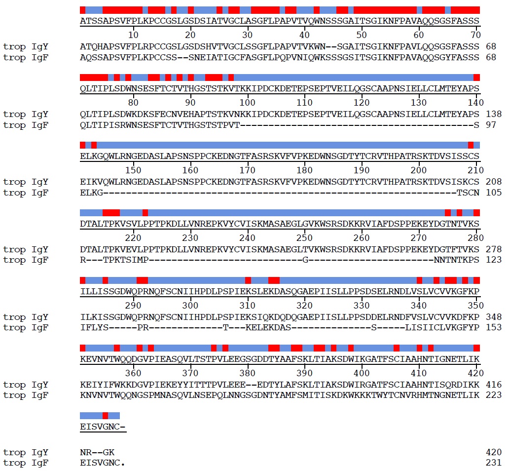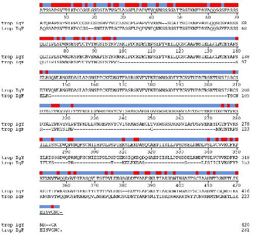 Fig. 17. Sequence alignment of the IgF and IgY heavy-chain constant regions in X. tropicalis. The alignment was performed by using the ClustalW method in MegAlign (DNASTAR). Trop, X. tropicalis.