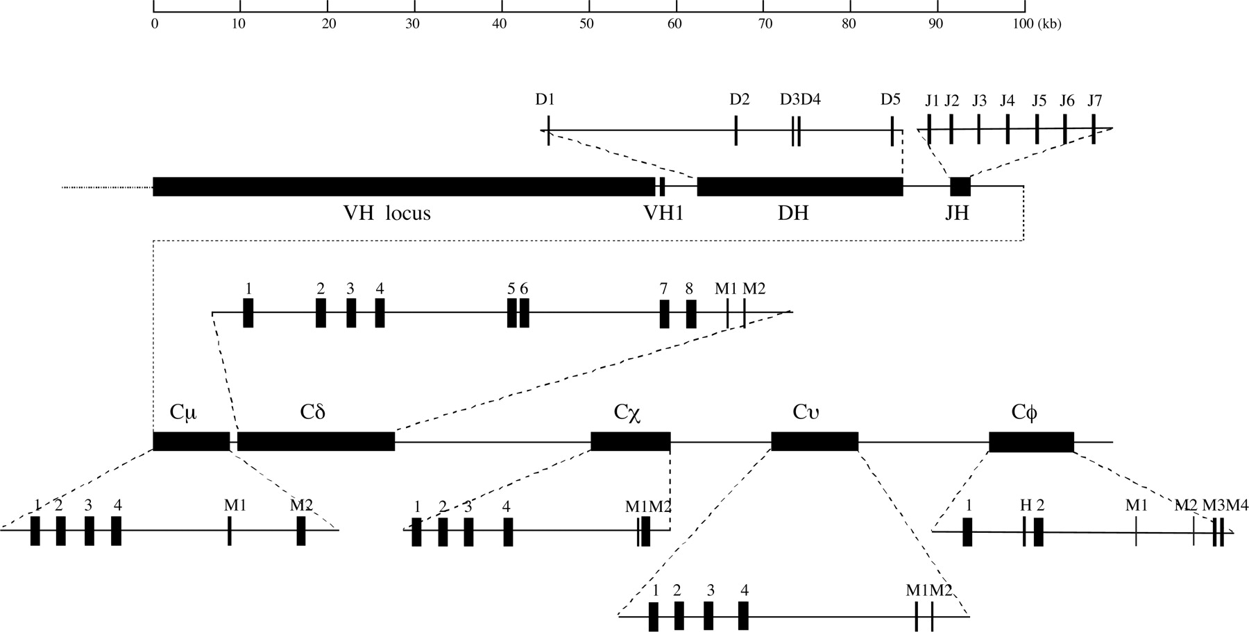 Assembly of the X. tropicalis IgH gene locus. VH, heavy-chain variable genes; DH, heavy-chain diversity gene segments; JH, heavy-chain joining gene segments; Cμ, IgM encoding gene; Cδ, IgD encoding gene. The filled boxes indicate exons encoding structurally conserved IgC domains: Cχ, IgX encoding gene; Cυ, IgY encoding gene; Cφ, IgF encoding gene; M, membrane exon. The domains encoding exons of each constant region gene are indicated with Arabic numbers. The position of the χCH1 exon is uncertain because it is missing in Scaffold_928 due to a small sequence gap. |