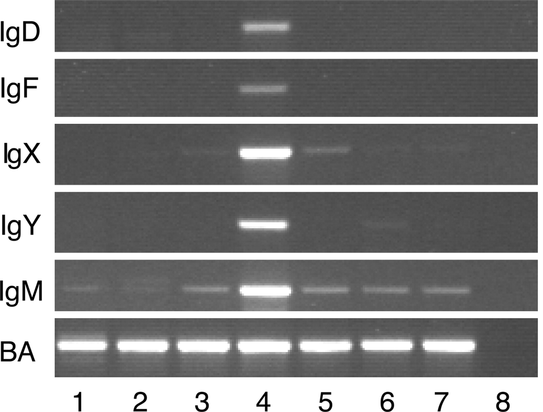 Expression of X. tropicalis IgD, IgF, IgX, IgY, and IgM in different organs as detected by RT-PCR. BA, β actin; 1, kidney; 2, thymus; 3, intestine; 4, spleen; 5, stomach; 6, liver; 7, caecum; 8, negative control. |