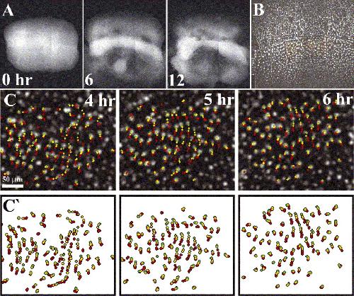 Fig. 4. Cell movement: from the marginal zone into the dorsal ridge. (A) Frames from a timelapse sequence of a single explant expressing a nuclear localizing GFP. Each frame is a montage of four images collected simultaneously from four quadrants of the explant. (B) A digitally enhanced closeup of the marginal zone showing the location of individual nuclei. (C) Frames from a timelapse sequence shown in the inset (dashed line in B) at 2 h intervals. Thirty-minute trajectories of cell nuclei in explants are overlaid on an image of nuclei positions. Green indicates the current position of the nuclei, yellow indicates positions 6 and 12 min earlier, and red indicated positions 18, 24, and 30 min earlier. (C0 ) The same frames as shown in C showing only the 30 min trajectories of nuclei. All panels are en face views with animal up and vegetal down.
