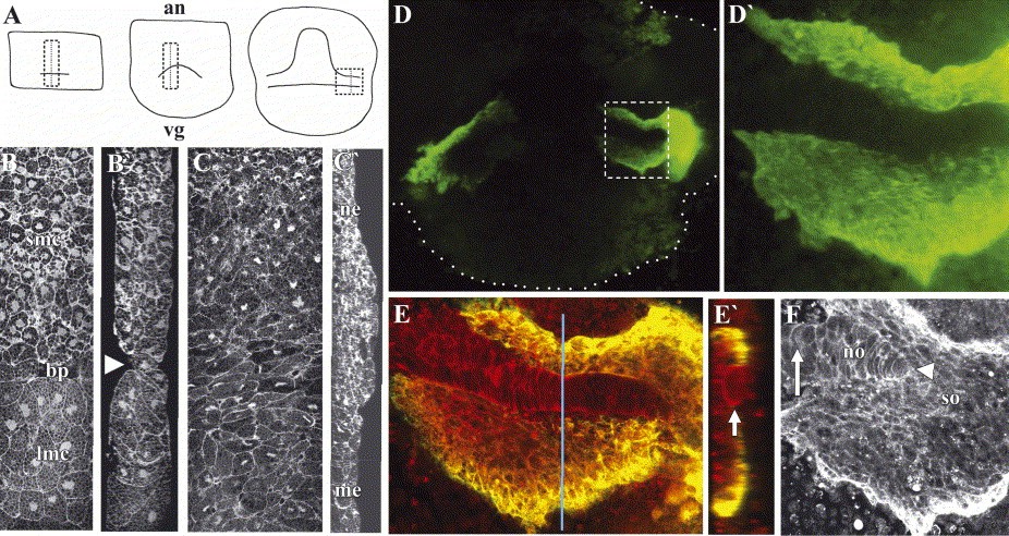 Fig. 3. Architecture of the marginal zone explant. (A) Schematic showing the three stages of explant morphogenesis. From left to right: shortly after microsurgery and plating on fibronectin (line shows blastopore), 4 h after isolation (line shows dorsal ridge), and 24 h after isolation (line shows neural anlagen boundary and dorsal ridge). Dashed line insets correspond to the location of XY-sections. Dotted line insets correspond to the location YZ-reconstructed cross- sections through the dorsal ridge. (B) A single en face XY-section through the early explant shows the small cell mesoderm (scm) animal of the blastopore (bp) and large cell mesendoderm (lcm) vegetal of the blastopore. (B0) A cross-section reconstructed from serial XY sections shows the mesendoderm is approximately 2 cells thick while the mesoderm is 4 â 5 cells in thickness. Mesoderm and mesendoderm are separated by the blastopore (arrowhead). (C) An en face XY-section through an explant cultured for 4 h shows mediolaterally elongated mesoderm cells within the dorsal ridge. (C0 ) A cross-section reconstructed from serial XY sections shows the dorsal ridge in cross-section where mesendoderm and neural tissues (me and ne, respectively) are approximately 2â3 cells thick while the dorsal ridge is 6â8 cells thick. (D) An en face stereoscope view of somites (stained with mAb 12/101) in an explant cultured for 24 h (approximate stage 25). Boundaries of the explant (not seen) are indicated by the dotted line. (D0) Higher resolution view of the somitic mesoderm (dashed line inset in D). (E) A single confocal section (75 mm from the coverslip) through the same region as in D0 showing a notochord running through the center of the somitic mesoderm. (E0) A cross-section at the location of blue line in E showing the notochord (arrow) cradled by the somitic mesoderm above the fibronectin coverslip (black line along the left). (E) A single confocal section showing the medial aspect (arrow) of the notochord (no) adjacent to the coverslip (20 mm deep). The notochord separates from the fibronectin substrate laterally (arrowhead) where it is underlaid by somitic mesoderm (so). All panels are en face views with the exception of B0, C0 and E0 and all panels have the same orientation of animal (an) up and vegetal (vg) down.