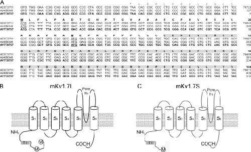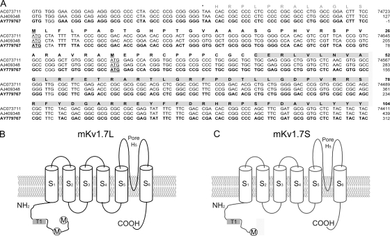Figure 1. mKv1.7 nucleotide and amino acid sequence. (A) Sequence alignment of the 5′ region of Kcna7. Nucleotide and amino acid sequence corresponding to the 5′ UTR and coding sequence for the cytoplasmic N-terminal domain of the mKv1.7 channels. The mouse chromosome 7 sequence AC073711, mouse cDNA fragment AJ409348 (Kashuba et al., 2001), and accession no. AY779767 (this work) sequences are >99% identical. Stop codon is marked with an asterisk, and initiation of the translation sites are underlined. Amino acids in bold correspond to the putative mKv1.7 N-terminal domain. (B and C) Schematic representation of the mKv1.7L and mKv1.7S constructs including the six hydrophobic domains (S1–S6), N and C cytoplasmic termini, and the pore region (H5). Initiation methionines are indicated by circles. The T1 domain is indicated by gray shaded boxes.