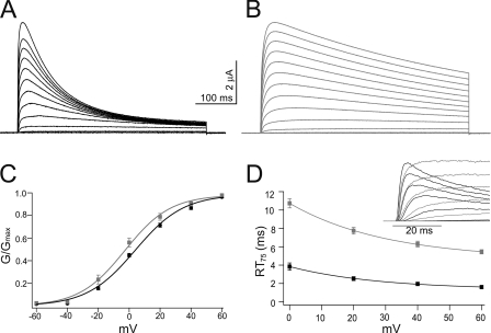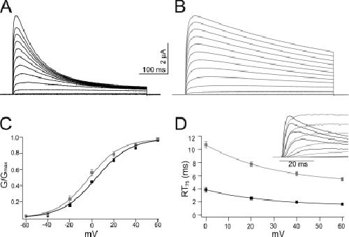 Figure 2. Activation of mKv1.7 channels. Representative outward currents in response to 500-ms depolarizing test potentials ranging from −60 to +80 mV in 10-mV increments, extracellular solution NFR, Vh= −100 mV. mKv1.7L is shown in black (A) and mKv1.7S in gray (B). (C) Steady-state activation curves for mKv1.7L (n = 20, black) and mKv1.7S (n = 15, gray). Mean ± SEM of the relative conductances are plotted against the potential. The smooth line corresponds to Boltzmann fits to the data. (D) Rise time plot of mKv1.7L (n = 13) and mKv1.7S (n = 20) currents measured as the time in ms required for reaching 75% of Imax (RT75) from on-cell patch clamp experiments. mKv1.7L data are shown in black and mKv1.7S in gray. The inset in D presents superimposed early current traces of on-cell patch clamp recordings of mKv1.7L and mKv1.7S channels.