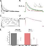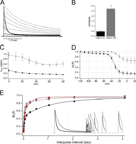 Figure 3. Inactivation of mKv1.7 channels. (A) Normalized and superimposed mKv1.7L (black) and mKv1.7S (gray) TEVC current traces elicited by a 2.5-s pulse from −60 to +80 mV, in 20-mV steps. (B) Bar diagram of the fractional current (steady-state current divided by peak current amplitude, Iss/Ipeak) of Kv1.7L and Kv1.7S channels (n = 15 and n = 13, respectively). (C) Inactivation time constants derived from monoexponential fits to the inactivation process, mKv1.7L (n = 15) and mKv1.7S (n = 13). (D) Steady-state inactivation was estimated by measuring the peak current amplitude elicited by 30-ms test pulses to 40 mV after 1.5-s prepulses to a −120 to 20 mV potential range. Current is plotted as a fraction of the maximum peak current and fitted with a Boltzmann function (n = 6 and 5 for mKv1.7L and mKv1.7S, respectively). (E) Recovery from inactivation. Time course of the recovery from inactivation of mKv1.7L and Kv1.7S channels is shown in the inset. The mean ± SEM P2/P1 ratio is shown as a function of time (2.5K+o mKv1.7L: black, n = 15; 2.5K+o mKv1.7S: gray, n = 6; 117.5 K+o mKv1.7L: red, n = 4).