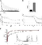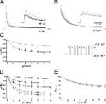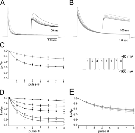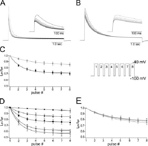 Figure 4. Cumulative inactivation of mKv1.7 channels, [K+]o dependence. Currents were elicited by a train of depolarizing pulses with duration of 5 s to +40 mV with an interpulse interval of 1 s from a Vh of −100 mV (inset in C). (A and B) Eight consecutive current traces from mKv1.7L and mKv1.7S, respectively. The insets contain first 500 ms of the corresponding currents of mKv1.7L in black and mKv1.7S in gray. (C) Cumulative inactivation time course plotted as the fraction of the current left after each consecutive pulse (Inth pulse/I1st pulse vs. pulse number). Smooth lines correspond to monoexponential fits (mKv1.7L in black, n = 15; and mKv1.7S in gray, n = 12). (D and E) Effect of different potassium concentrations over cumulative inactivation of mKv1.7L and mKv1.7S, respectively. Data are given as average values of four oocytes per K+ concentration (K+o in mM: ◯, 2.5; ▵, 5; ▪, 20; ▴, 50; ♦, 117.5).