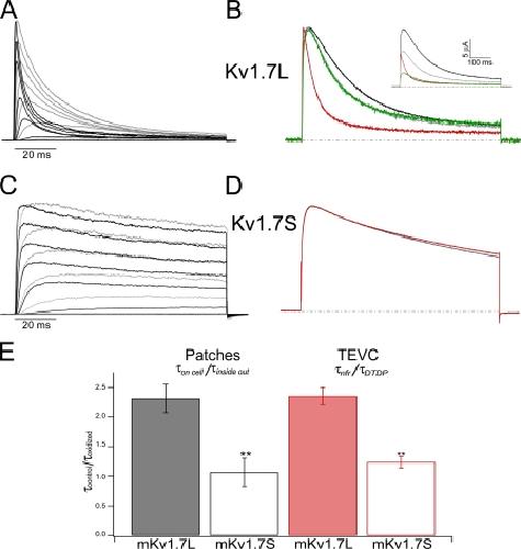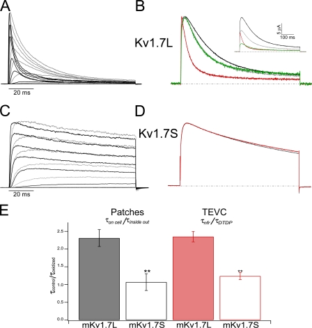 Figure 5. Redox sensitivity of mKv1.7. (A) Superimposed on-cell and inside-out patch clamp records from the same patch containing mKv1.7L channels. Gray corresponds to recordings in the on-cell configuration; black represents the currents under inside-out condition. Test pulses between −60 and +80 mV in 20-mV steps; Vh = −100 mV. (B) Normalized TEVC current traces from mKv1.7L exposed to different redox conditions (black corresponds to NFR; green, DTT; red, DTDP; and gray is washout with NFR). The inset presents the nonnormalized experiment. The dashed lines correspond to 0 current level. (C) mKv1.7S from a patch experiment (colors as in A). (D) mKv1.7S TEVC experiment (colors as in B). (E) Relative change in the inactivation time constant upon oxidation of Kv1.7L (solid bars, n = 6) and Kv1.7S (empty bars, n = 4) channels. Time constants obtained from monoexponential fits to the current decay upon +40-mV pulses under control conditions (τcontrol) divided by inactivation time constant under oxidizing conditions (τoxidized, τinside out, τDTDP).