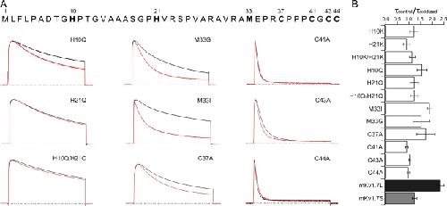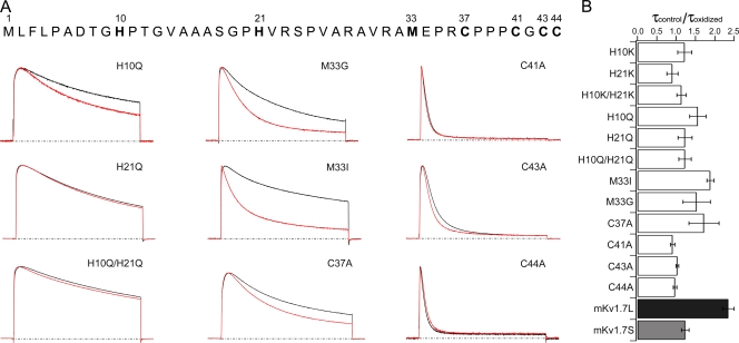 Figure 6. N-terminal determinants of mKv1.7 channels redox sensitivity. (A) Scaled and superimposed current traces of the different N terminus mutants (+40 mV, 500 ms, Vh = −100 mV) of Kv1.7L. Black traces correspond to recordings under control conditions (NFR) and red traces are currents recorded in the presence of 300 μM DTDP. The dashed lines correspond to 0 current. Mutations are indicated in each panel. (B) Relative change in the inactivation time constant upon oxidation of mKv1.7 mutant channels. Time constants obtained from monoexponential fits to the current decay upon +40 mV pulses under control conditions (τcontrol) divided by inactivation time constant under DTDP oxidizing conditions (τoxidized) (mean ± SEM; n = 5–15).