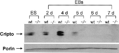 Figure 3. Cripto expression profile during the in vitro differentiation of ES cells. Total lysates of either undifferentiated ES cells or EBs at different days of differentiation (2–7 d), derived from either RI (wt) or DE7 (Cripto−/−) ES cells, were collected in lysis buffer and analyzed by Western blot using a polyclonal anti-Cripto antiserum (Minchiotti et al., 2000). Data were normalized to the expression level of Porin.