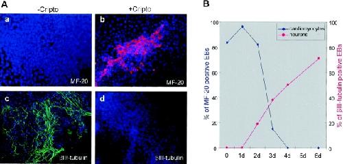 Figure 5. Cripto promotes cardiomyocyte differentiation and inhibits neural differentiation of ES cells according to the timing of exposure. (A) Cardiomyocyte versus neuronal differentiation of Cripto−/− EBs as revealed by indirect immunofluorescence. 2-d-old Cripto−/− EBs, derived from DE7 cell line, were either left untreated (a and c) or treated for 24 h with 10 μg/ml of recombinant Cripto protein (b and d). On day 12 of in vitro differentiation, expression of either sarcomeric myosin or βIII-tubulin was revealed by immunofluorescence using anti–MF-20 (red, a and b) or βIII-tubulin (green, c and d) antibodies, respectively. Data are representative of at least two independent experiments. Comparable results were obtained with Cripto−/− DE14 ES cell line. (B) Cardiomyocyte versus neuronal differentiation of Cripto−/− EB–derived cells depends on the timing of exposure to Cripto. Percentage of Cripto−/− EBs stained for βIII-tubulin (red plot) or MF-20 (blue plot) after addition of recombinant Cripto protein at different time points. 10 μg/ml of recombinant Cripto protein was added to EBs at 24-h intervals starting from time 0 of the in vitro differentiation assay. On day 12 of in vitro differentiation, EBs were stained for either βIII-tubulin or MF-20 antibodies. Data are representative of two independent experiments.